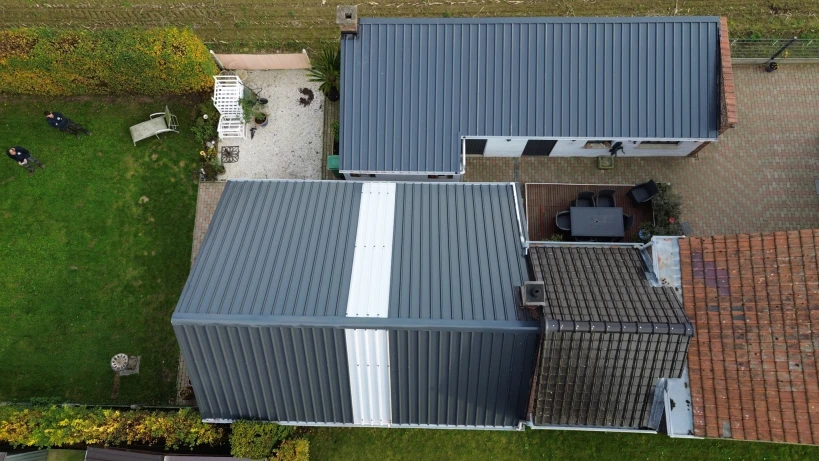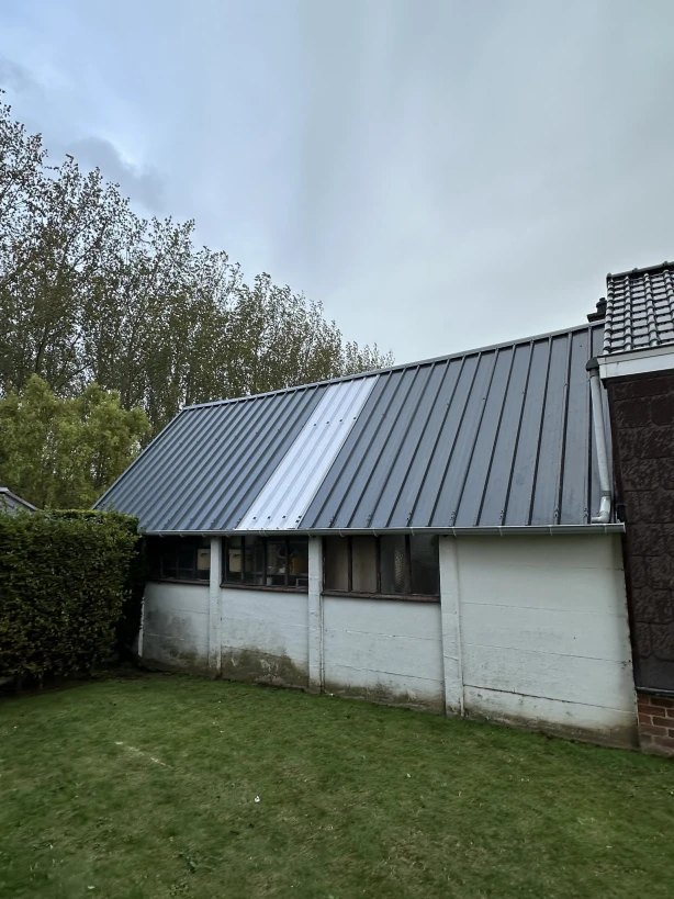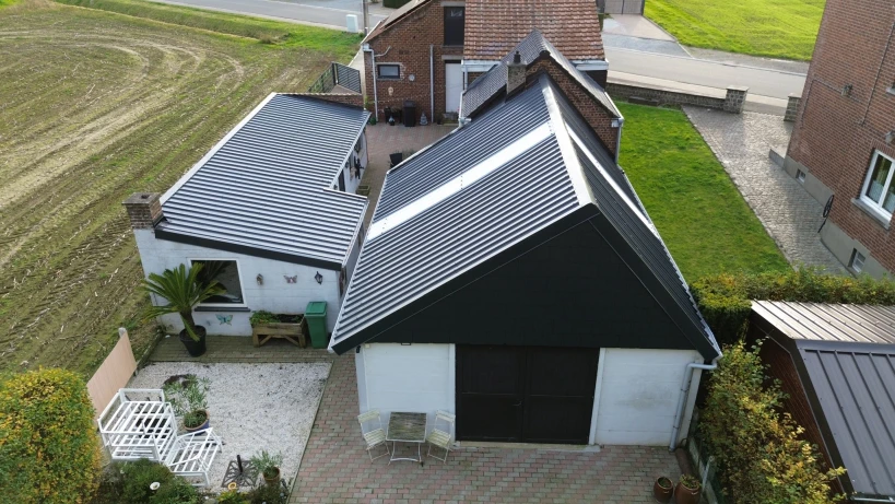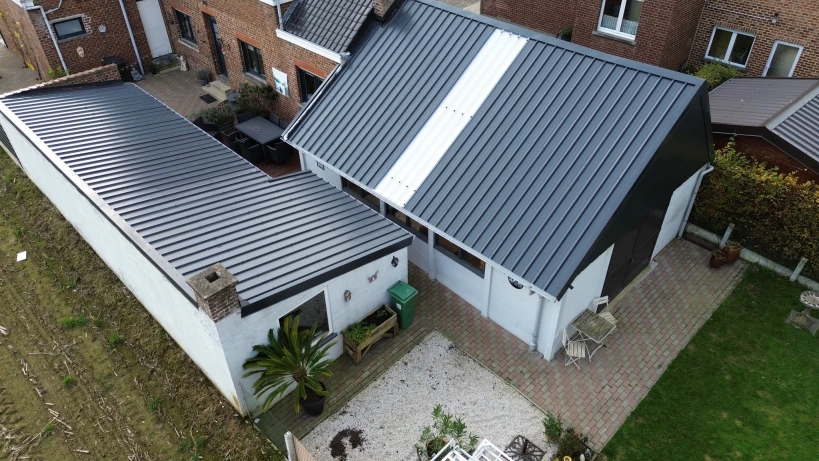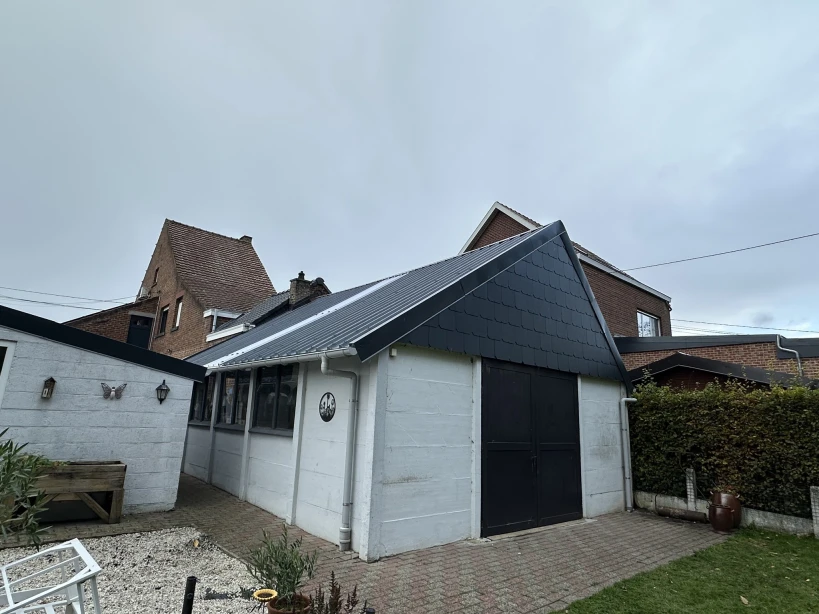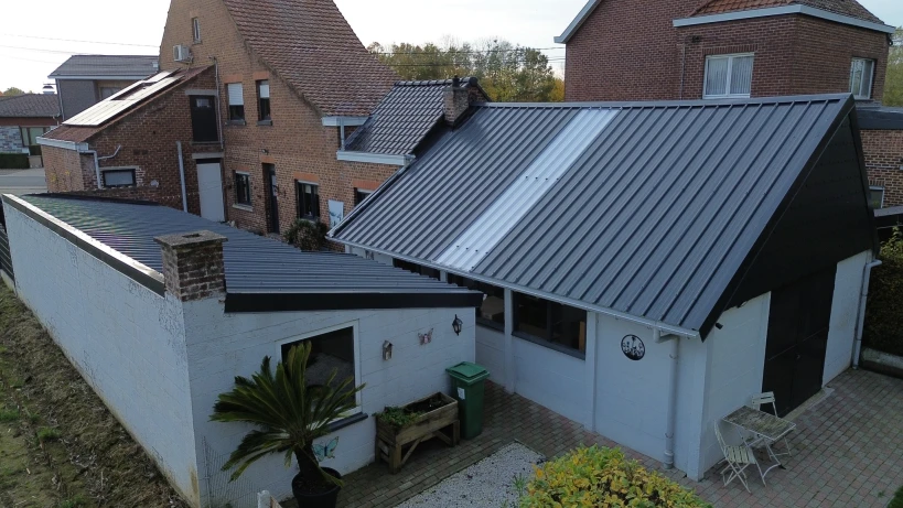 ❌ Afbraak van asbesthoudende golfplaten ✅ Geïsoleerde Joris Ide dakplaten ✅ Geïsoleerde Joris Ide lichtstraten ✅ PVC hanggoten en afvoerbuizen ✅ Gevelbekleding met Alterna leien 60x32